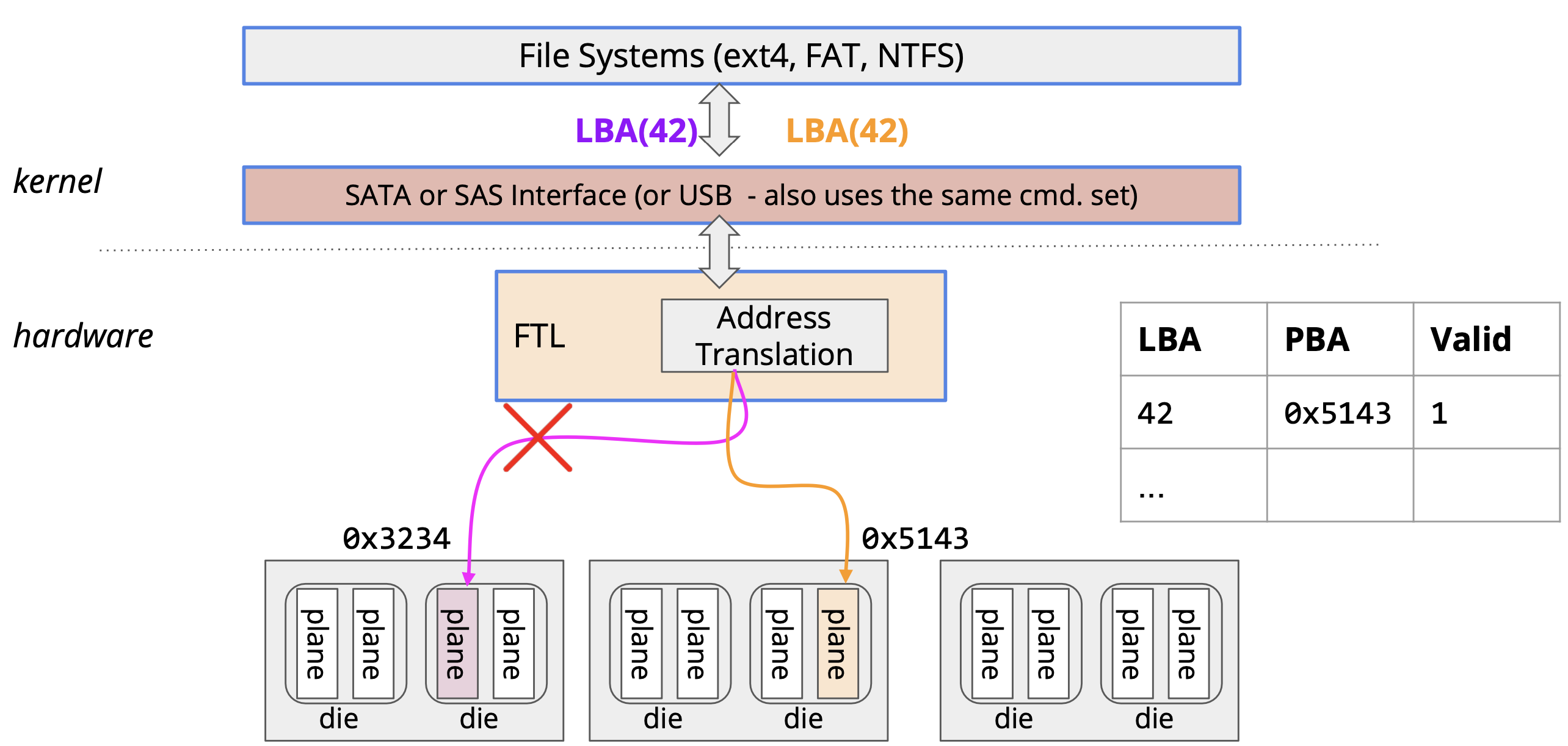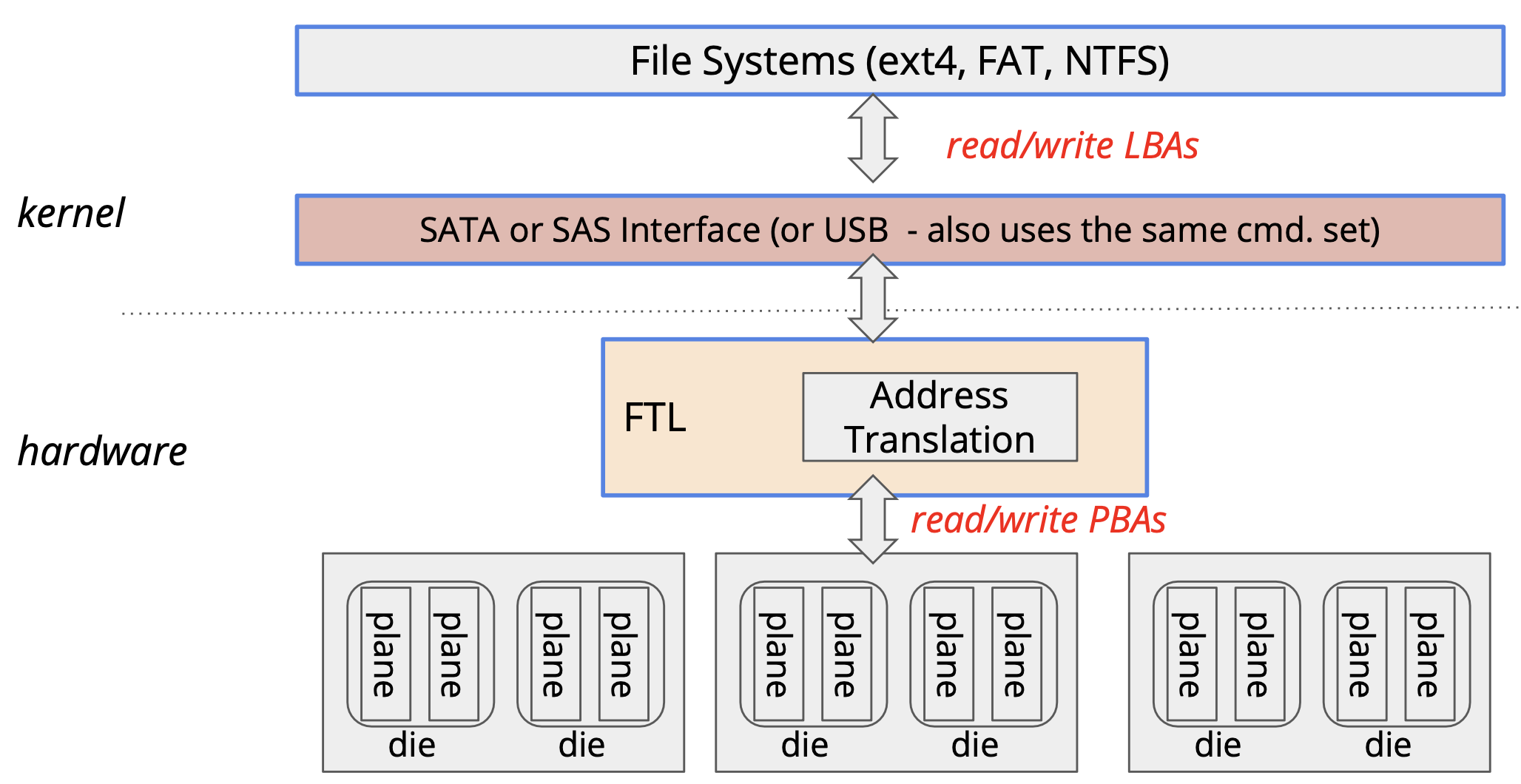 file system은 logical file/folder의 구조를 관리하고 file data를 읽고 쓰기 위한 interface를 제공한다. file system은 LBA를 사용해서 data를 읽고 쓰고, FTL은 이런 LBA를 PBA로 변환해서 SSD에 쓰거나 SSD에서 읽어들인다.
