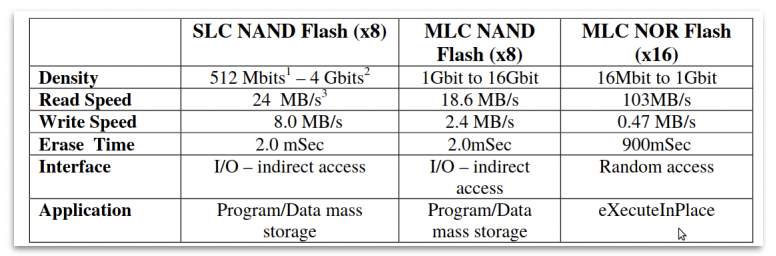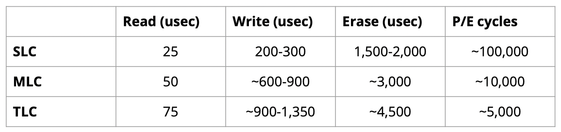 Flash storage cell은 Single-Level(SLC), Multi-Level(MLC) or Triple-Level(TLC)일 수 있다.