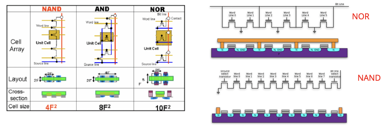 - NOR cell은 read and write performance가 좋지만 density가 낮다.