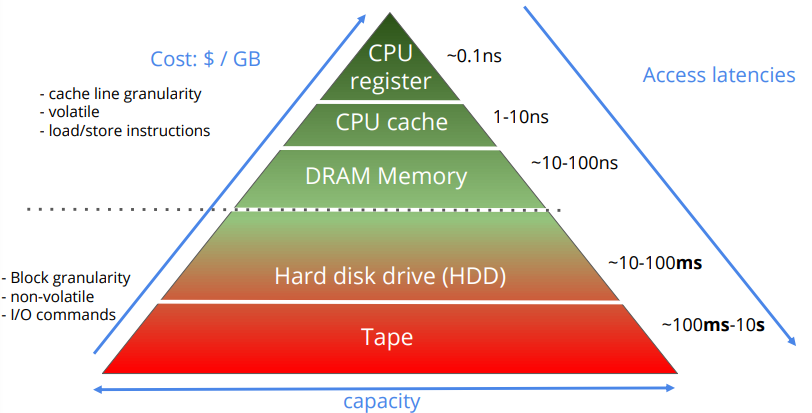 즉, OS에서는 computer의 memory를 두 가지로 나눠서 관리한다. 첫 번째로, OS는 CPU가 직접적으로 주소를 지정해서 접근할 수 있는 memory space를 관리한다. 이를 physical memory or system memory라고 한다. 두 번째로, OS는 storage media(HDD, SSD, etc.)와 같은 non-volatile memory를 관리한다. 이런 memory는 CPU가 직접적으로 접근할 수 없고, storage media를 통해 block data transfer 방식으로 data를 주고 받는다. 이를 storage라고 한다.