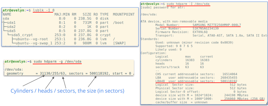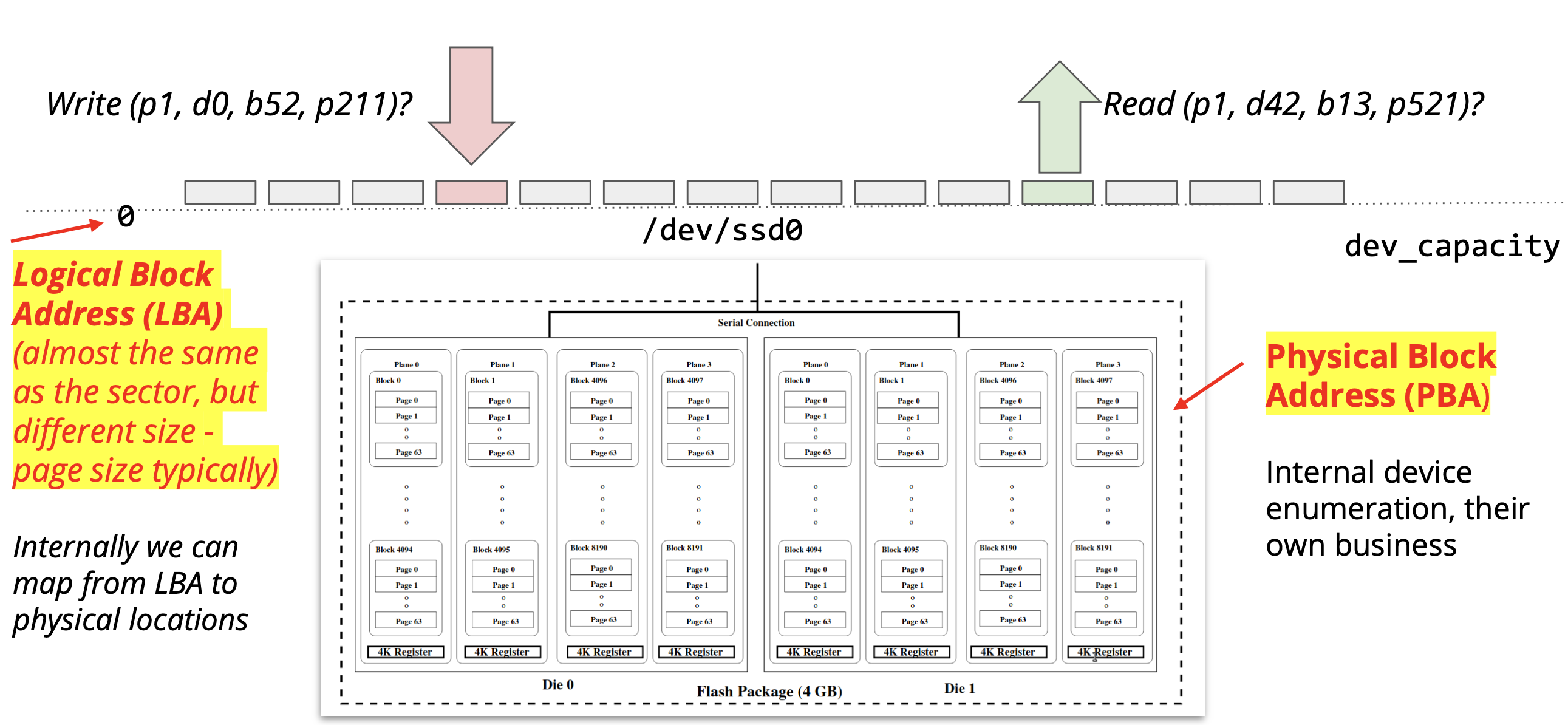 LBA(Logical Block Address)는 (보통 page size와 다르지만 거의 동일한) 논리적인 sector를 가리키는데 사용된다. 내부적으로, LBA에서 physical locations으로 mapping할 수 있다. PBA는 internal device enumeration(내부 장치 열거)을 위해 사용되는 주소로, 외부에서는 사용되지 않는다.