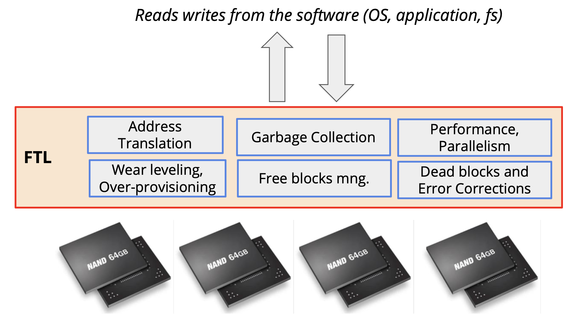 - Address Translation, Garbage Collection, Performance, Parallelism, Wear leveling, Over-provisioning, Free blocks mng, Dead blocks and Error Corrections
