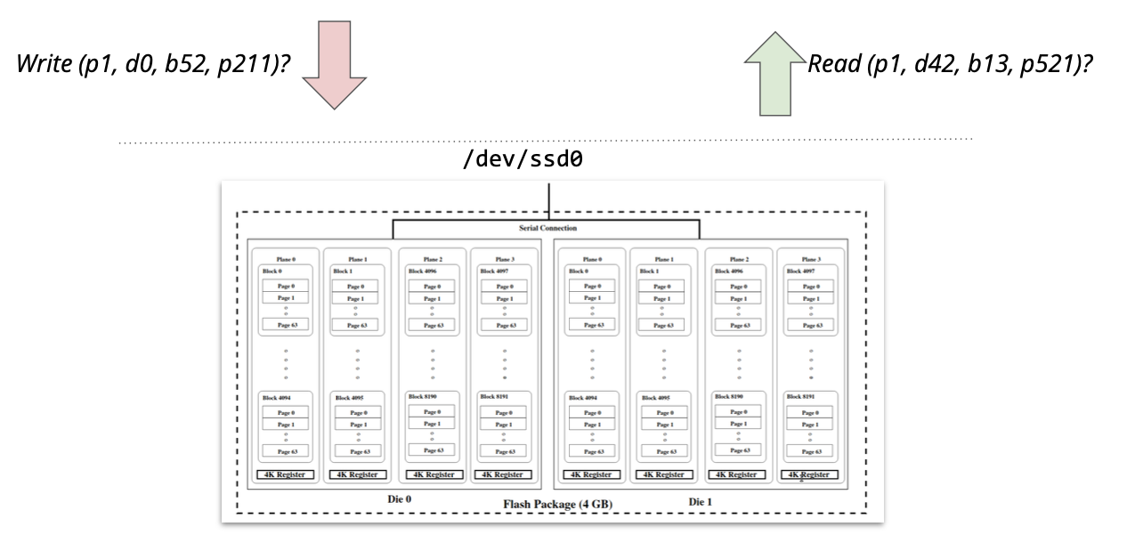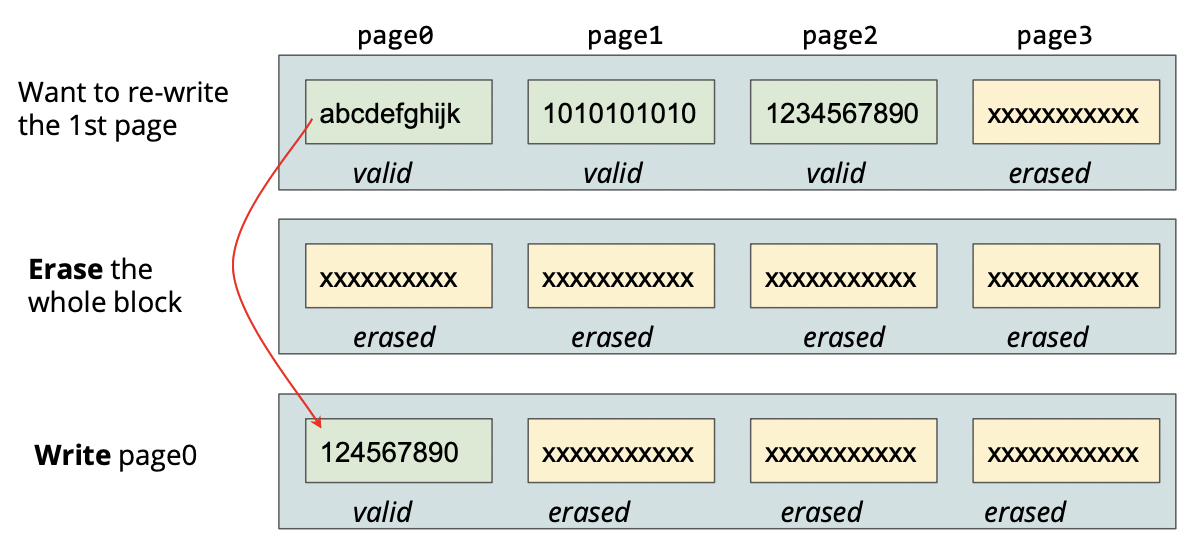 만약 overwrite를 하고 싶다면 physical space에서는 in-place update가 안되므로 다른 장소에 쓰고 기존에 있던 데이터를 erase하는 작업을 거친다.