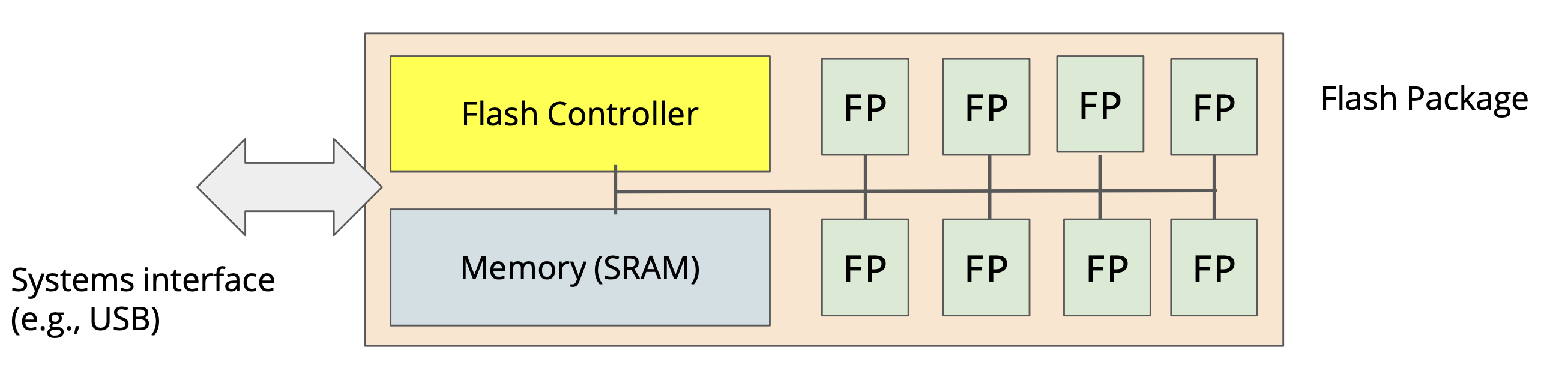 (₩중간 지식₩) drive 내부에는 여러 개의 Flash chip이 package 형태로 구성되어 있다. 즉, package는 flash chip을 여러 개 묶어서 한 개의 package로 만든 것이다. 이러한 package는 drive에 다시 묶여서 drive 내부의 일정 영역에 놓인다. 이런 구성으로, drive capacity는 flash chip의 개수와 각 chip의 용량에 따라 결정된다. flash memory를 사용하는 drive는 일반적으로 controller chip도 내장되어 있다. 이 controller chip은 flash memory를 관리하고, data를 읽고 쓰는 등의 작업을 처리한다.