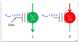 Flash Storage는 data를 bit 단위로 저장한다. flash cell # transistor를 통해 전류가 흐르는 것을 조절하는 isolated floating gate가 있다. Electron이 FG(Floating Gate)에 갇혀서 threshold voltage을 준다. Gate에 알려진 reference voltage을 적용해서 FG에 전자가 갇혀 있는지 확인한다. pass through = 1, blocked 0 . So, single cell에서는 0 또는 1을 저장할 수 있다.