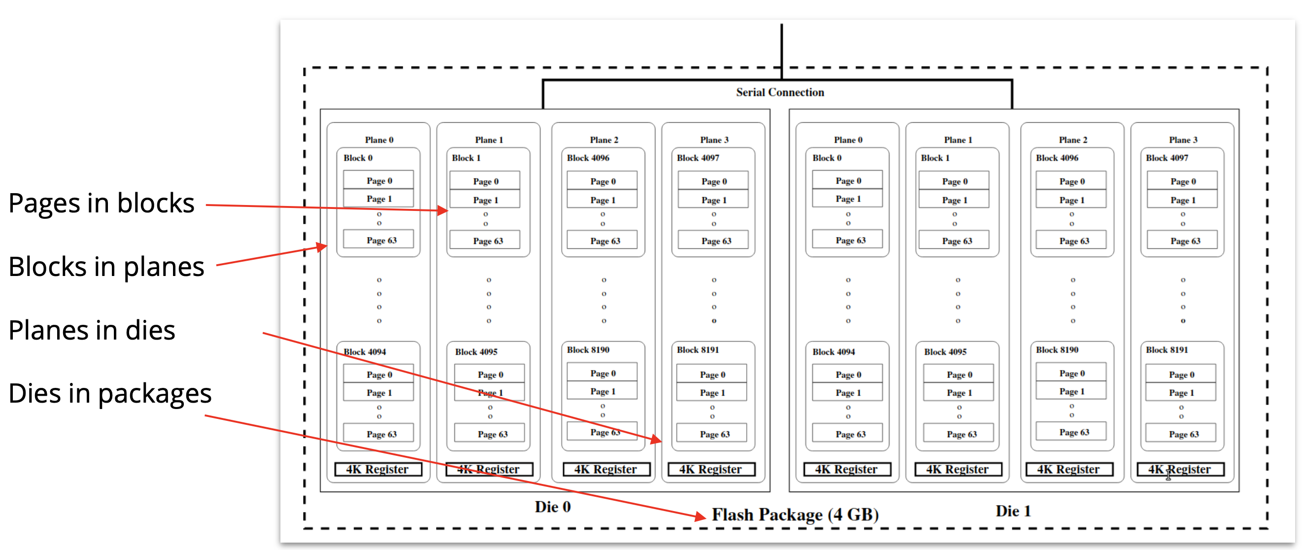 보통 한 page는 4KB의 크기를 갖는다. 이 page는 일반적으로 unit of I/O이다. 한편, 여러 page를 모아서 block을 만든다. 이 block은 보통 64-128-256 개의 page로 구성되며, 수 메가바이트가 된다. block은 보통 erase 단위로 사용되고, erase를 해야만 flash cell에 다시 쓸 수 있다. 따라서, Flash cell을 쓰기 전에는 반드시 지워져야 한다. (여기서 회사나 시스템에서는 chunk와 같이 다른이름을 사용할 수도 있다. 당황하지 말자.), 정확한지는 모르겠지만 chunk는 전송할 때 data를 작은 덩어리로 나눈 것, block은 storage media에서 데이터를 read/write하는 최소 단위, sector는 HDD에서 data를 읽거나 쓰는 최소 단위로 알고있다.