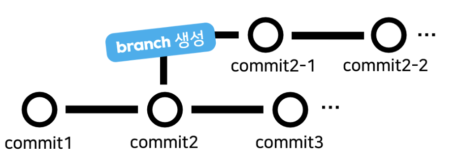 commit 1을 했을때가 master branch (main branch) 이고 거기서 두번째 commit을 하고 나서 새로운 기능을 만들거나 혹은 협업을 할 시에 branch 생성을 한다.